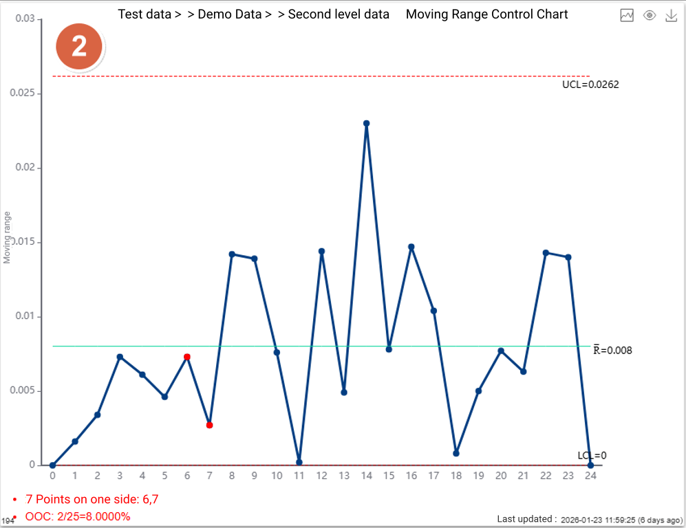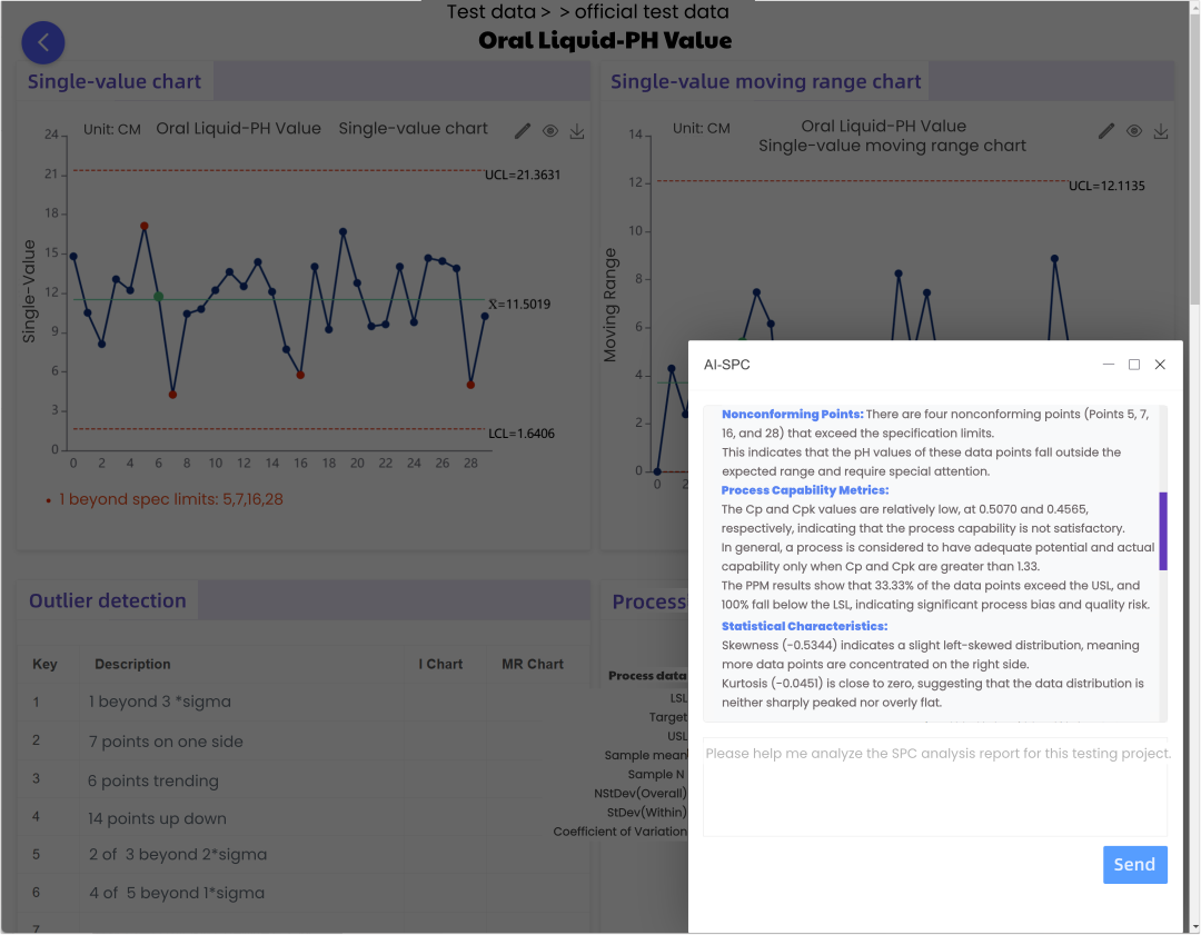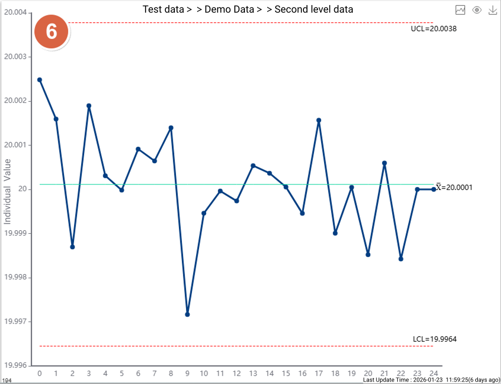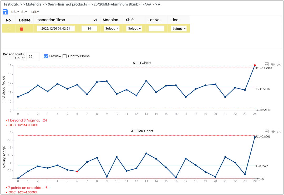 Once inspection data flows into the system—via manual entry, Excel upload, or real-time industrial protocols (TCP, MQTT, OPC, Web API, CSV)—the control chart updates dynamically without page refresh and highlights abnormal points instantly in red.