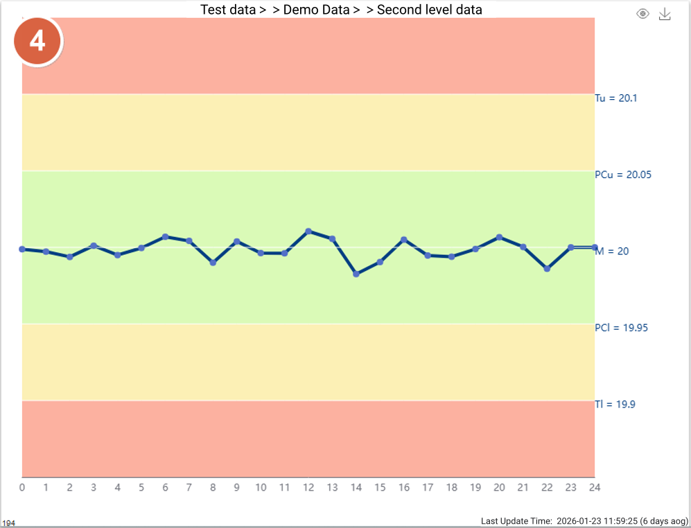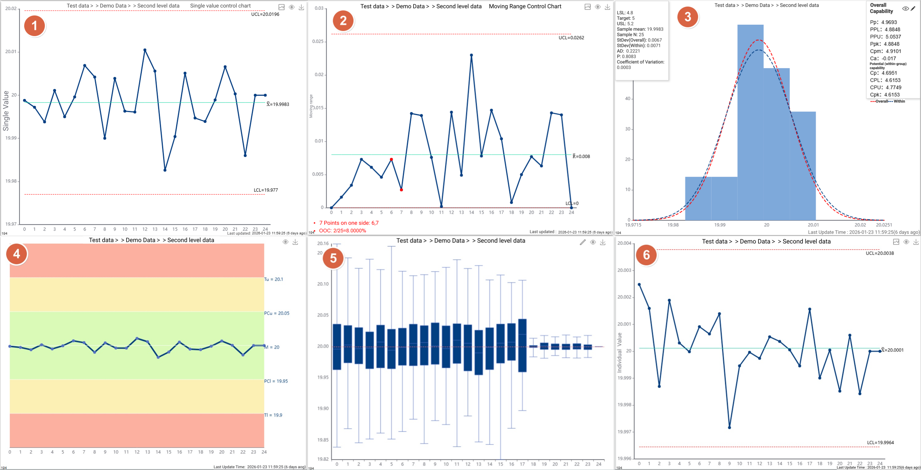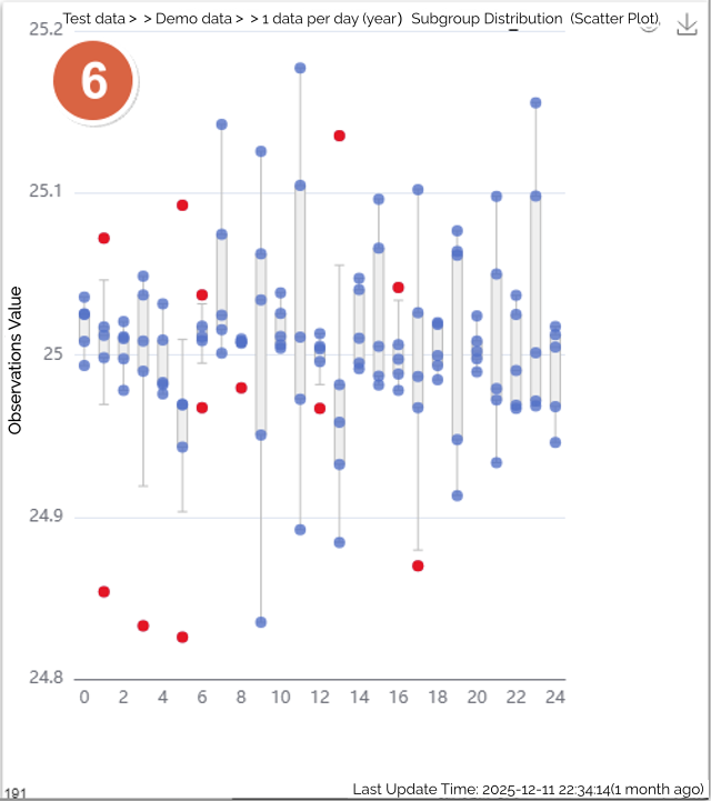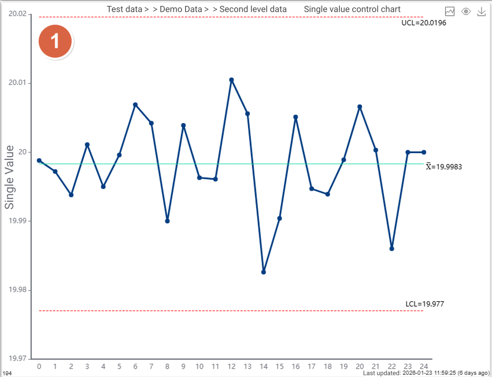 Once inspection data flows into the system—via manual entry, Excel upload, or real-time industrial protocols (TCP, MQTT, OPC, Web API, CSV)—the control chart updates dynamically without page refresh and highlights abnormal points instantly in red.
